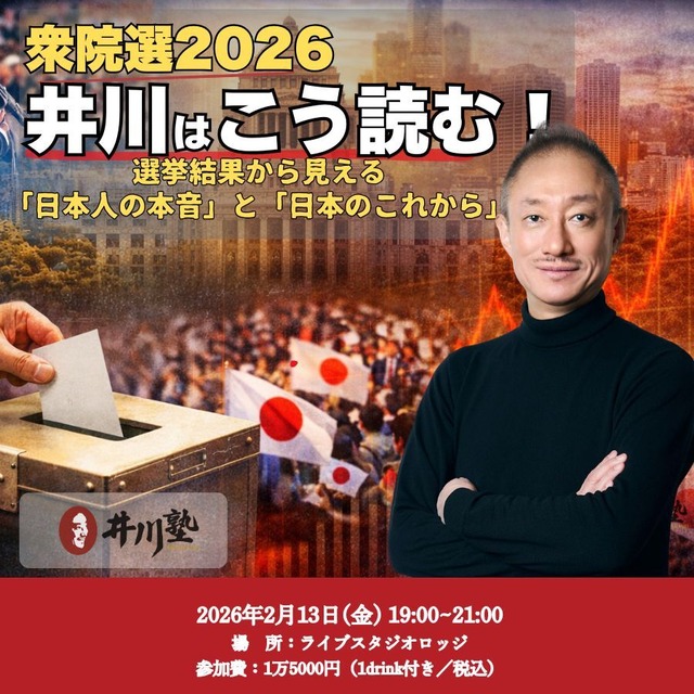 ■選挙は“始まる前”から、もう見えにくくなっている 1月27日、衆議院選挙が公示されました。 これから投票日までの約2週間、日本中が選挙報道に包まれます。 情勢予測、支持率、失言、炎上、街頭演説── テレビ、新聞、ネット、SNSには「今この瞬間」の情報があふれ、私たちは考える前に反応することを求められます。 しかし、すでに多くの人が感じているはずです。 ——情報は多いが、全体像が見えない。 ——結局、選挙後のその “先”がどうなるのかがわからない。 今回の井川塾は、投票日(2月8日)から5日後の2月13日に開催されます。勝敗と議席数が出そろい、感情的な論評や拙速な予測が一巡した“その後”です。 だからこそ可能になるのが、結果を冷静に受け止め、「では、この先どうなるのか」を正面から考えることです。 ■数字の裏に滲み出た、日本人の本音とは 本企画で井川意高氏が語るのは、単なる選挙総括ではありません。 焦点は、数字の裏ににじみ出た日本人の本音、有権者心理、そして社会全体の空気です。 ●なぜこの政党は伸びたのか? ●なぜ話題になっていた勢力は、思ったほど支持を集めなかったのか? ●有権者は「何を選んだ」のか、それとも「何を避けた」のか? ●そこにあったのは期待なのか、不安なのか、あるいは諦めなのか? 選挙期間中には表に出てこない水面下の動きや、現場でしか感じ取れない空気感。 さらに、日本保守党員として選挙を見てきた立場だからこそ感じた違和感や、クローズドな場だからこそ語れる内輪話も交えながら、選挙結果の“裏側”を整理していきます。 ■選挙後、日本の政治はどう動くのか そして本トークライブの大きな見どころが、「この結果を受けて、日本の政治は向こうしばらくどう動くのか」という井川氏独自の分析。 政界再編? 離合集散? 選挙結果を踏まて、永田町にはどのような力学が働くのか? 公約に掲げられた政策は本当に動くのか、それとも言葉だけが先行するのか? 一見すると安定して見える局面の裏で、何が進み、何が止まるのか? 次の選挙までに起きること、起きないこと……。 選挙直後だからこそ語れる、希望的観測ではない現実的な見通しが示されます。 ■「直接聞ける!」クローズドな質疑応答 もちろん当日は、井川氏に直接質問できる時間をたっぷり確保しています。 政治の話はもちろん、選挙結果への疑問、今後の日本への不安、自分なりの問題意識まで、テーマは問いません。 YouTubeやSNSでは不可能な、双方向でのやり取りも、井川塾ならではの醍醐味です。 選挙期間中の喧騒の中で、あらかじめ「選挙後に考える場」を予約しておく。 結果を受け取って終わりにせず、その先の現実と向き合うための120分。 選挙が終わった“その後”にこそ必要な、本音と予測を含んだトークライブ。 今回の選挙を、ただの出来事で終わらせたくない方に、ぜひご参加ください。 ============================ 開催情報 ■日時 2月13日(金)19時〜21時(18時30開場) ============================ ■場所 LIVE STUDIO LODGE(ライブスタジオ ロッジ) 渋谷区代々木1丁目30-1 代々木パークビル B1 https://live-lodge.jp/ ============================ ■価格 15,000円(1ドリンク付/税込) ============================ ■先着順(当日並ばれた順) ※開場時刻の10分前より整列を開始いたします。 ※入場をお待ちいただく際は会場の角に沿って待機をお願いいたします。 ※再入場不可 ※キャンセル不可 ============================